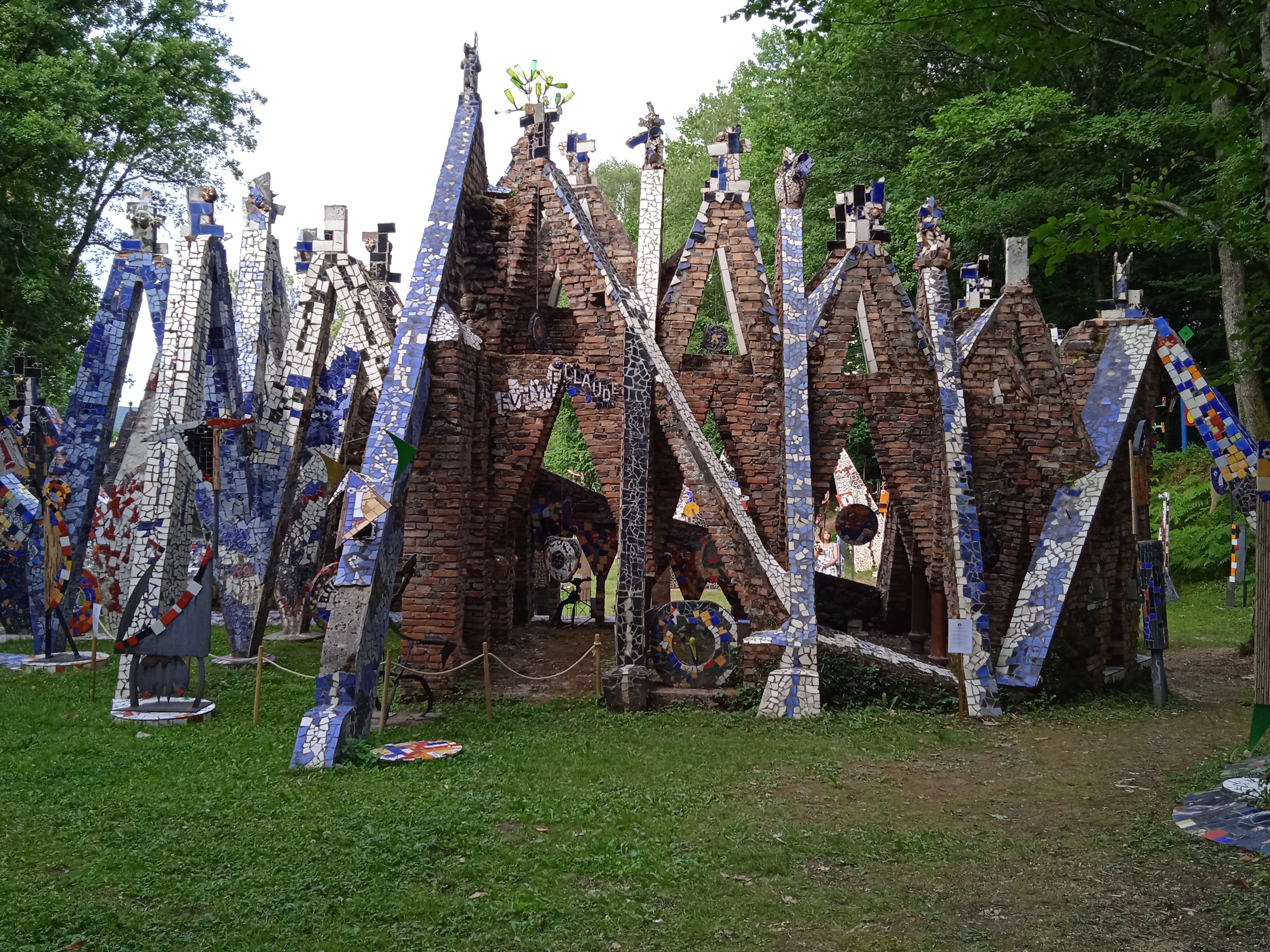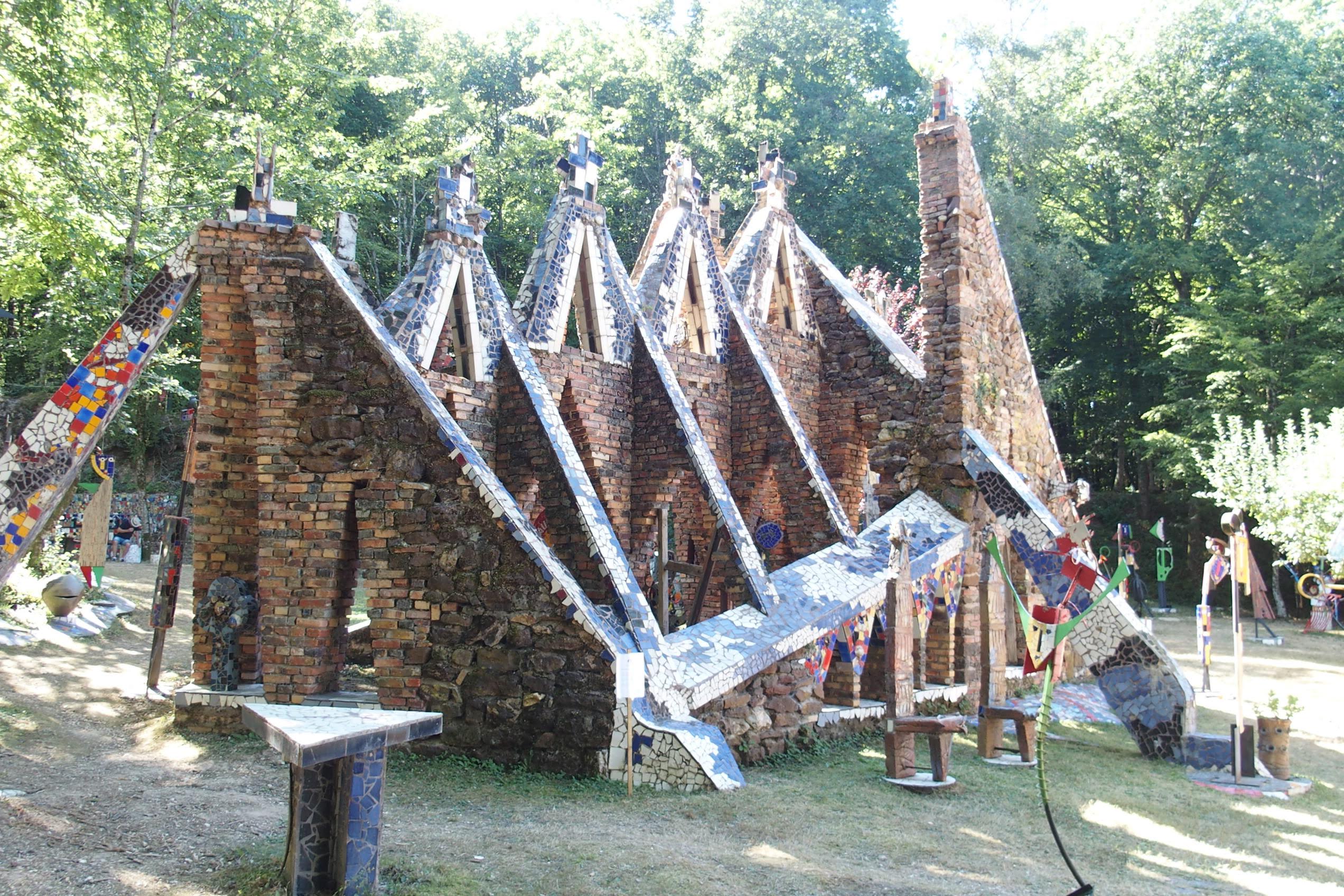Cathédrale extraordinaire, au milieu d'une forêt, construite avec des bouts de pièces en céramiques et en verre.