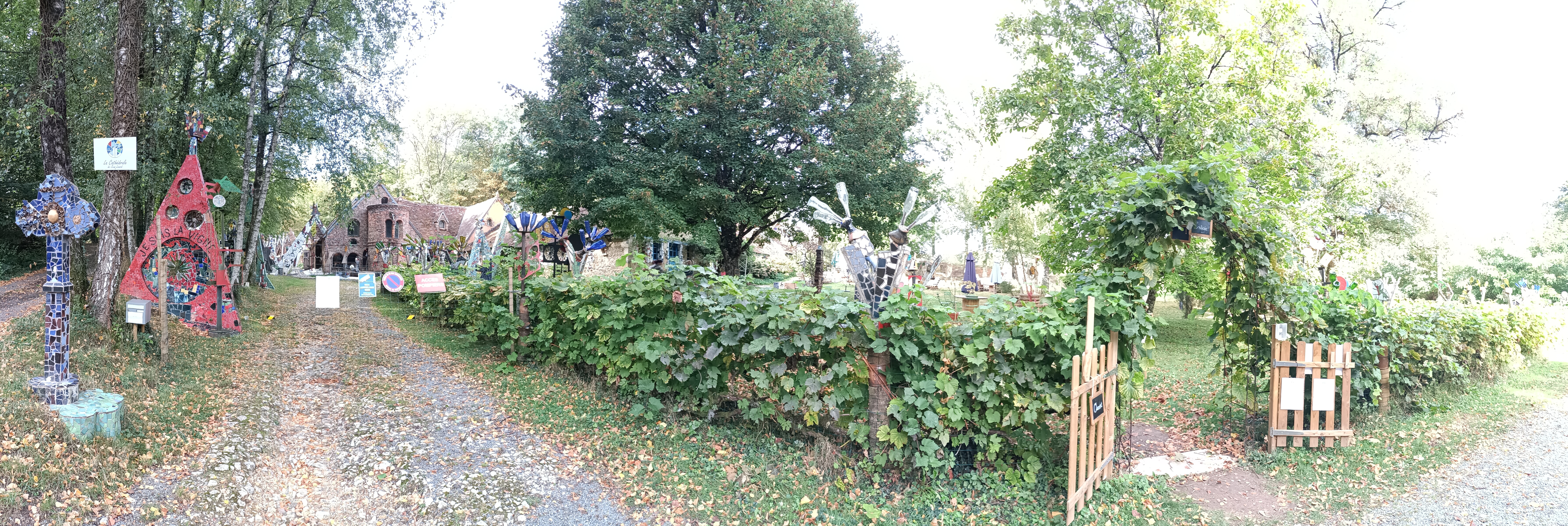 Un lieu unique avec un artiste qui a su transformer et mettre en valeur des matériaux existants.Un recyclage coloré , il a imaginé,créé des personnages et nous fait voyager dans un monde de fraternité où chacun trouve sa place .Un hymne à la paix et à la tolérance.Une visite sous le soleil refléte la lumière dans ce petit monde verdure .Nous recommandons la visite guidée à 15h .Une reprise avec plein de projets à la clef. On peut y passer un long moment et se poser dans le jardin amenagé avec des matériaux recyclés pour boire un verre ou plus.